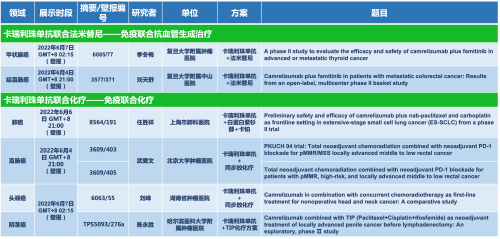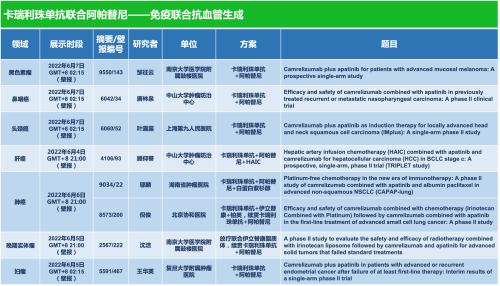 卡瑞利珠单抗联合j9国际站的另一款创新药法米替尼在甲状腺癌和结直肠癌领域有2项研究被接收为壁报,另有卡瑞利珠单抗联合化疗的4项研究在肺癌、结直肠癌、头颈癌和阴茎癌领域的研究被接收为5份壁报。
