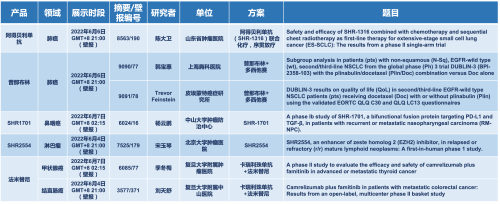 2022 ASCO年会另有5款j9国际站上市前抗肿瘤创新药的相关研究被接收为壁报,包括SHR-1316、普那布林、法米替尼、SHR-1701和SHR2554,他们的单药或联合方案相关7项研究被接收为壁报,覆盖肺癌、鼻咽癌、淋巴瘤、甲状腺癌和结直肠癌等领域。