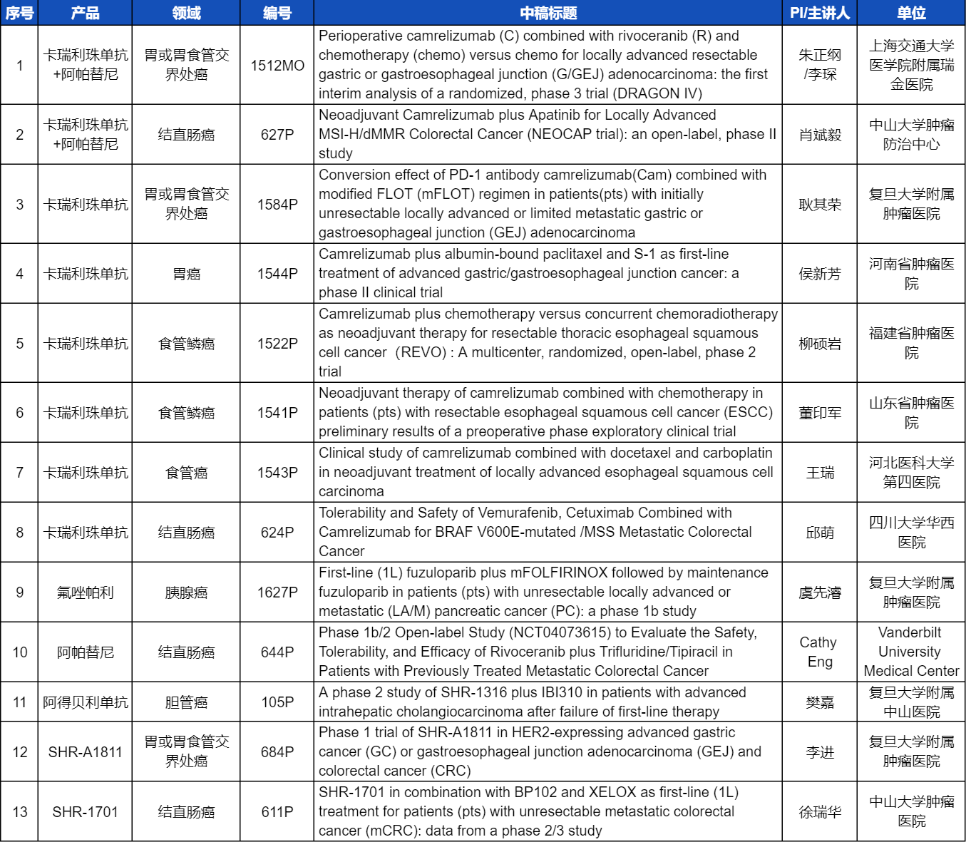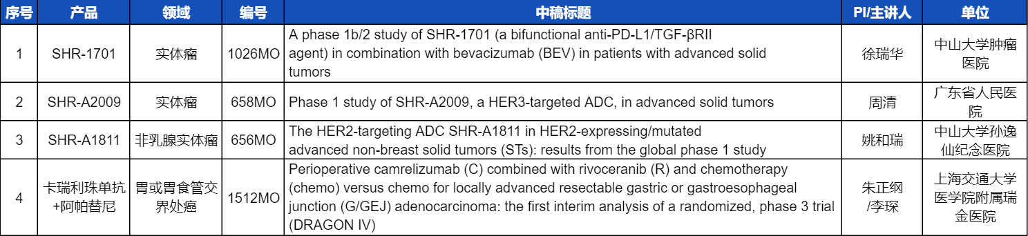本次ESMO大会,将由中山大学肿瘤医院徐瑞华教授、广东省人民医院周清教授、中山大学孙逸仙纪念医院姚和瑞教授、上海交通大学医学院附属瑞金医院李琛教授分别就4项j9国际站创新产品相关研究做口头报告,包括SHR-1701、SHR-A2009、SHR-A1811这3款未上市创新产品的实体瘤治疗临床研究,以及1项“双艾”组合(卡瑞利珠单抗联合阿帕替尼)治疗局部晚期可切除胃/胃食管交界处癌的Ⅲ期临床试验期中分析。
