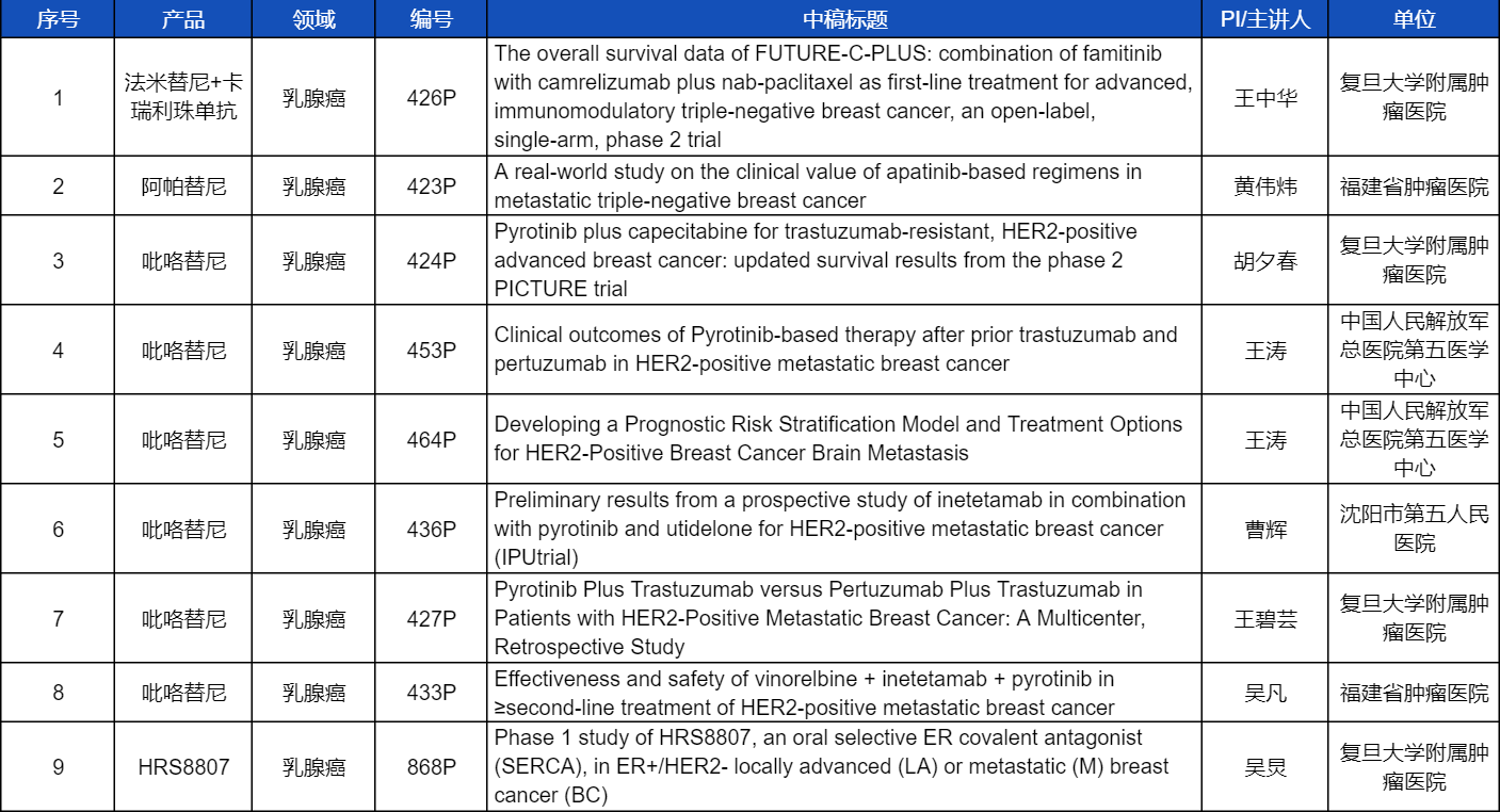 在乳腺癌领域,吡咯替尼、阿帕替尼、卡瑞利珠单抗、法米替尼,或产品间联合或联合化疗,共有9项研究入选壁报讨论,其中吡咯替尼占据6项,较为全面地展示了这款中国首个自主研发抗HER2靶向药在乳腺癌治疗中的显著特点和潜力。此外,j9国际站自主研发的新型选择性雌激素受体共价拮抗剂(SERCA)HRS8807治疗ER+/HER2-局部晚期或转移性乳腺癌的Ⅰ期研究也成功入选,有望为此类患者带来更多用药新选择。
