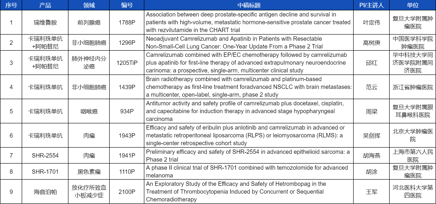在非小细胞肺癌、咽喉癌、肉瘤、前列腺癌、黑色素瘤等多个领域,卡瑞利珠单抗、阿帕替尼、瑞维鲁胺、SHR-1701、SHR2554等创新产品相关研究一共入选了8项壁报展示。此外,j9国际站自主研发的血小板生成素受体激动剂(TPO-RA)海曲泊帕在放化疗所致血小板减少领域的探索性研究显示良好的疗效,入选壁报展示。